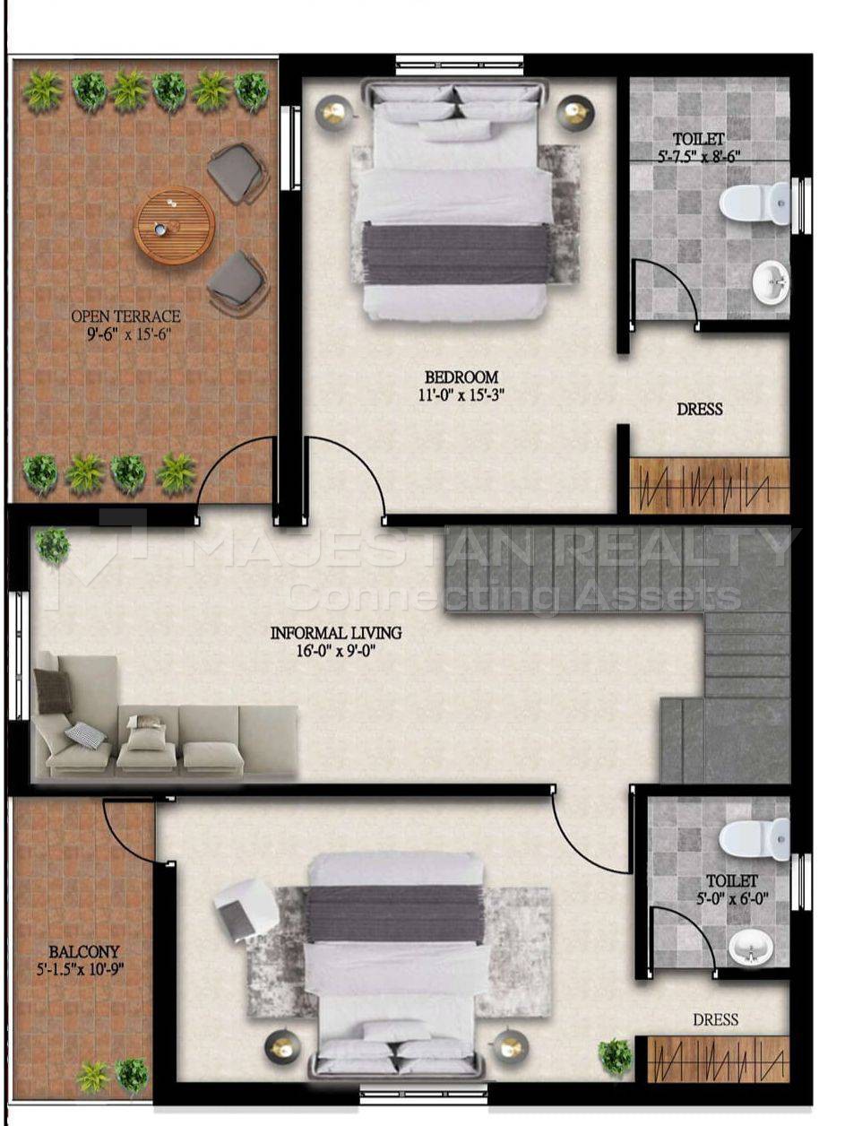 These 3BHK villas come with a spacious 16×9 ft living room, 8×9 ft dining area, and large bedrooms, including a 15×14 ft master suite. The open plan allows for excellent natural light and ventilation, creating a warm and welcoming ambiance.